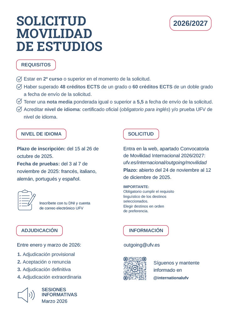 La Universidad Francisco de Vitoria, a través del Vicerrectorado de Internacionalización, convoca anualmente plazas para la movilidad internacional de sus estudiantes para realizar estudios de Grado en universidades socias con las cuales la UFV ha suscrito acuerdos de intercambio. El objetivo de estos intercambios es el reconocimiento académico y mejora del perfil curricular de los estudiantes participantes. La convocatoria actual para el curso 2026/27 permanecerá abierta del 24 de noviembre al 12 de diciembre de 2025. Solo se aceptarán las solicitudes recibidas dentro del plazo establecido.
