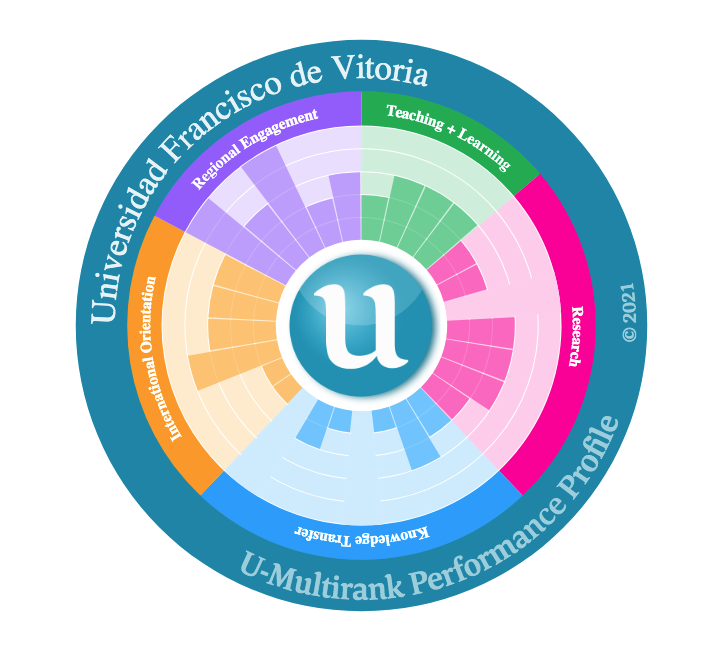 Desde una perspectiva global, los resultados de U-Multirank en 2021 muestran que las universidades españolas han tenido un desempeño particularmente fuerte en la evaluación del Desarrollo y Compromiso Regional, donde la Universidad Francisco de Vitoria se ha clasificado como la 1ª universidad española y la 9ª universidad europea en el indicador que evalúa las publicaciones científicas realizadas en colaboración con instituciones regionales. De esta manera, un 76,1% de las publicaciones de la universidad indica que al menos uno de los coautores posee una filiación en una institución localizada dentro de un radio de 50 km de la universidad.