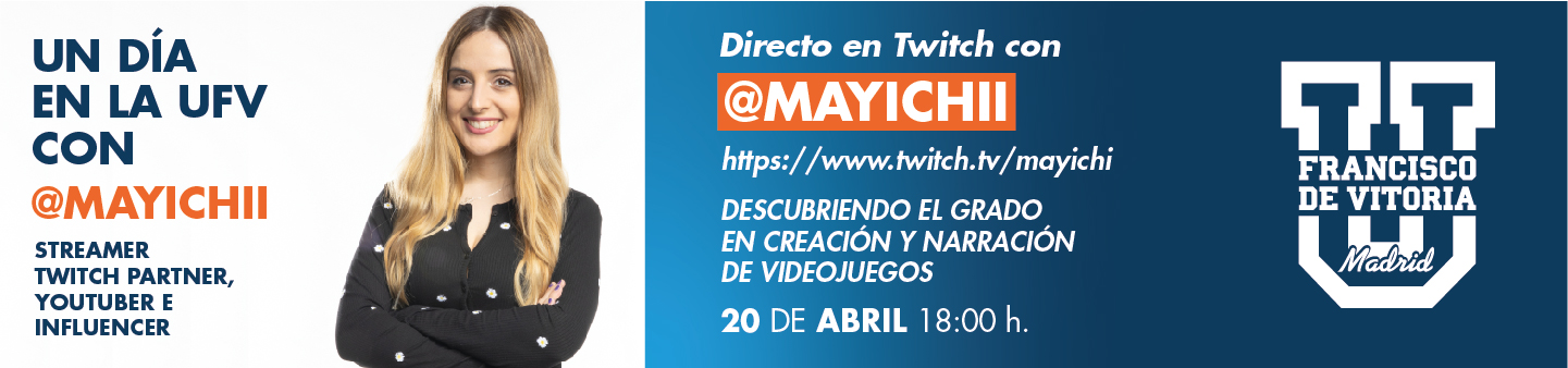 El próximo martes 20 de abril @Mayichii visitará la UFV para descubrir el Grado en Creación y Narración de Videojuegos. Compartirá un día con los alumnos para conocer de primera mano su día a día en la universidad tanto dentro como fuera de las Aulas. La visita finalizará con un directo en su canal de Twitch a las 18:00h.